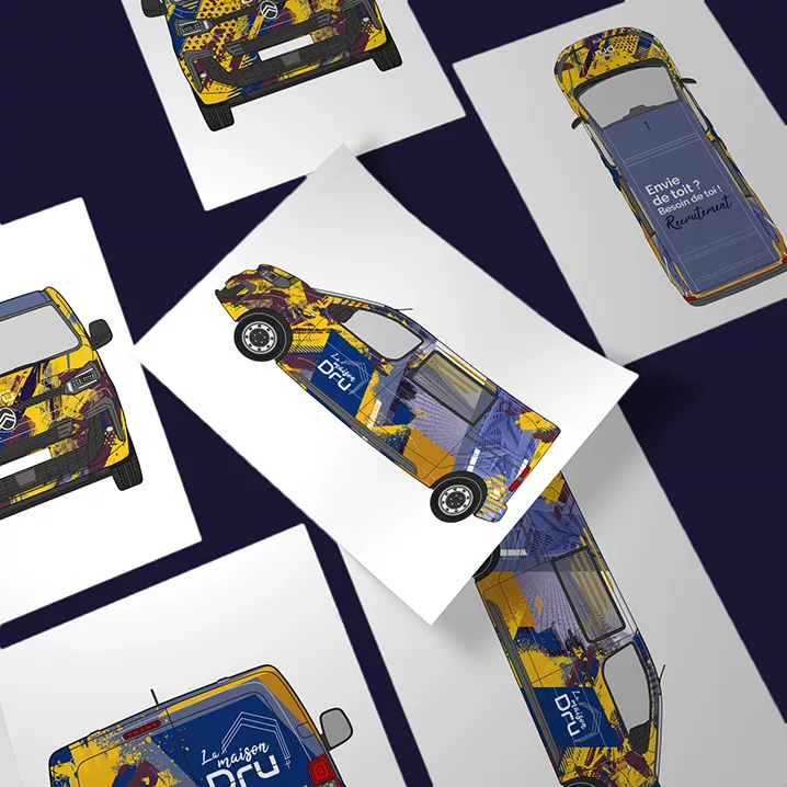 L’objectif créatif était clair : concevoir un covering personnalisé de véhicule qui attire l’attention sans trahir l’ADN métier de La Maison Dru. Nous avons donc travaillé une composition très graphique, plus colorée (bleu, orange, jaune), pensée pour rendre le véhicule visible, mémorable et original sur la route. Le traitement visuel intègre des rappels subtils de l’univers toiture/charpente via des éléments en filigrane, pour conjuguer impact commercial et cohérence sectorielle. Résultat : un véhicule qui devient un véritable support de communication mobile, aussi utile en prospection qu’en image de marque.